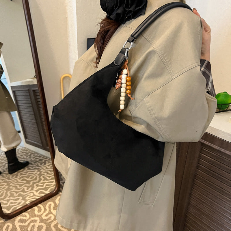 Discover the perfect blend of comfort and style with our Suede Bag. The spacious main compartment fits all your daily essentials, supported by a secure zip closure and an easy-access interior. Its shoulder strap offers comfortable all-day carry, while the lightweight, flexible hobo silhouette adapts beautifully to your movement. Bag Charm is included!